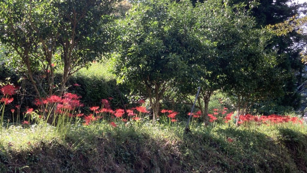 記録的猛暑が続き彼岸花の開花も遅れるのではと思いきや、「暑さ寒さも彼岸まで」の慣用句どおり朝晩は気温が下がって過ごしやすくなりホッと一息。そして、彼岸花もしっかり開花。那賀町ドローンマップのスポットでもある川口ダム湖周辺のとくしま・なかカヌーセンター上流側の群生が咲き誇ってました。ちなみに鷲敷さくら公園の樹木の一部に紅葉と落葉ありました。