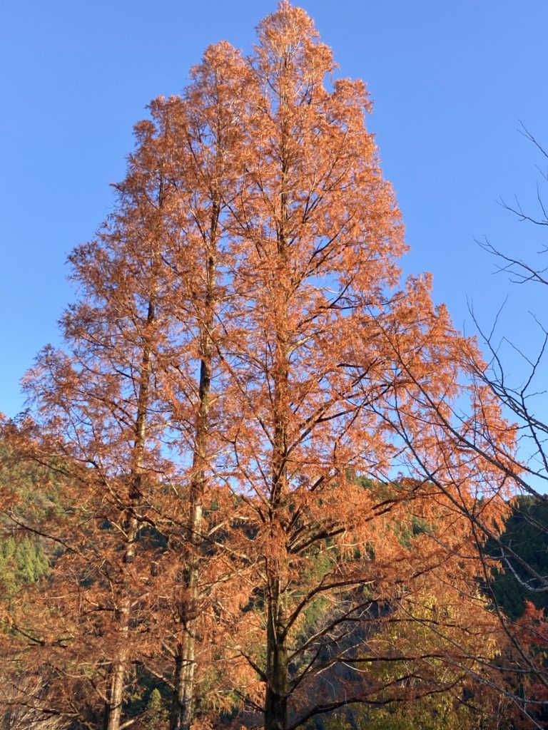 今週真ん中あたり相当強い風が吹き荒れたので鷲敷B&G野外活動センターのイチョウはすっかり落ちてしまいました。それでもメタセコイアは強く残っていました。